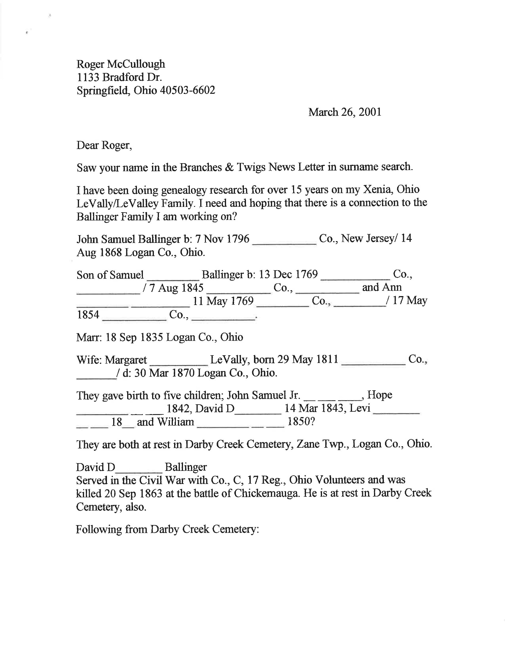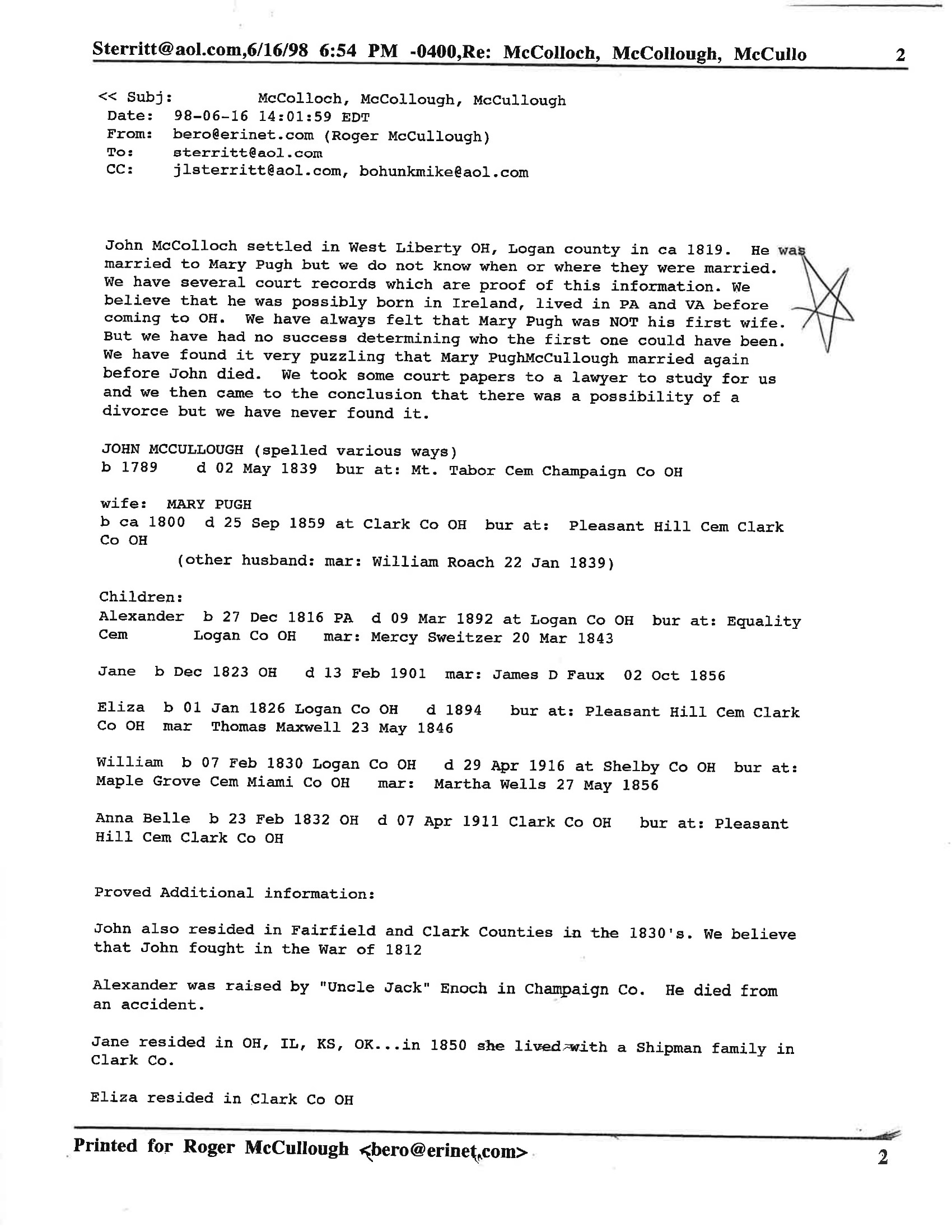 She and her husband Roger McCullough worked closely together on the research. Roger connected with other McCullough descendants, tracked down records, and traded findings by letter and later by email. But Betty was the engine — the one who kept the threads organized, who cross-referenced the census data with the family sheets, who wouldn't let a lead go cold.